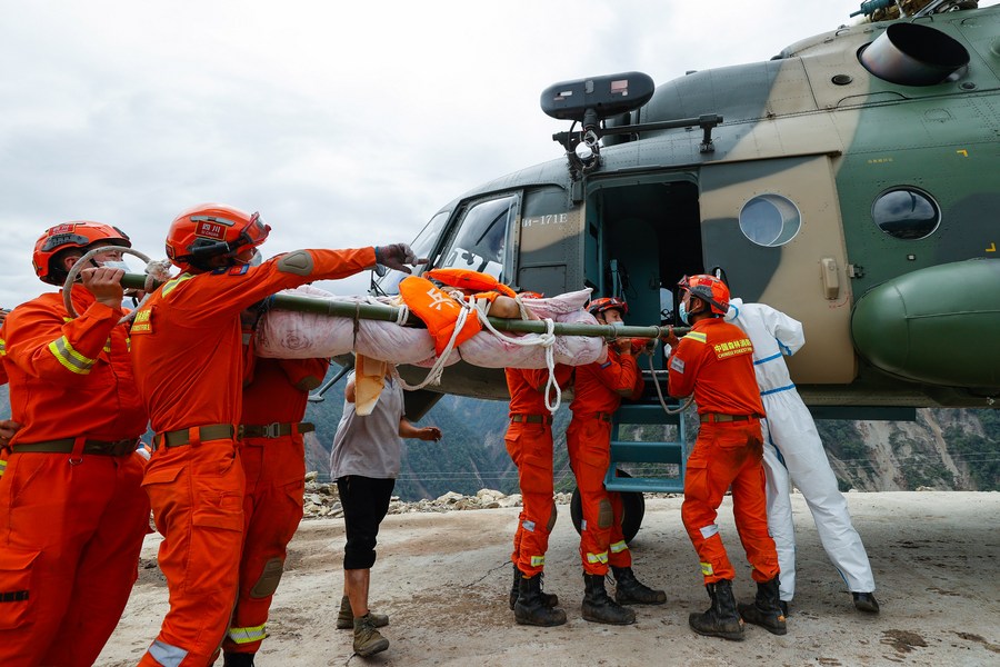 Rescuers transfer an injured resident evacuated from Detuo Town in Luding County, southwest China's Sichuan Province, Sept. 6, 2022. A total of 74 people have been killed and 26 remain missing after a 6.8-magnitude earthquake jolted Luding County in southwest China's Sichuan Province on Monday, local authorities said Wednesday. (Xinhua/Shen Bohan)