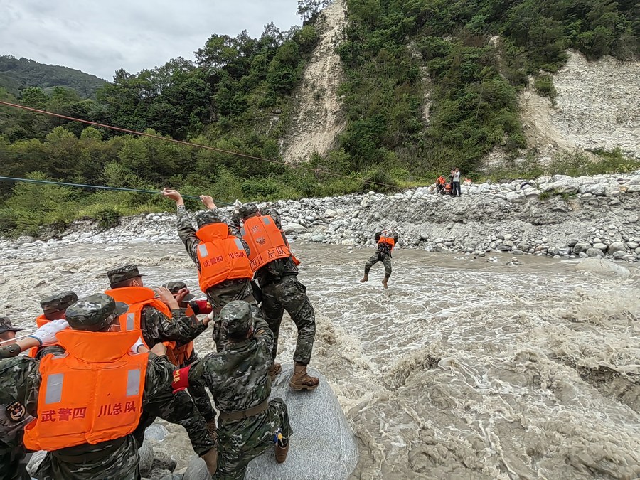 Rescuers cross a river via a cableway in Moxi Town of Luding County, southwest China's Sichuan Province, Sept. 6, 2022. Over 2,700 military and armed police personnel have been dispatched, as of 5 p.m. Tuesday, to assist with disaster response after a 6.8-magnitude earthquake struck Luding County in southwest China's Sichuan Province on Monday. (Photo by Zhang Wenxuan/Xinhua)