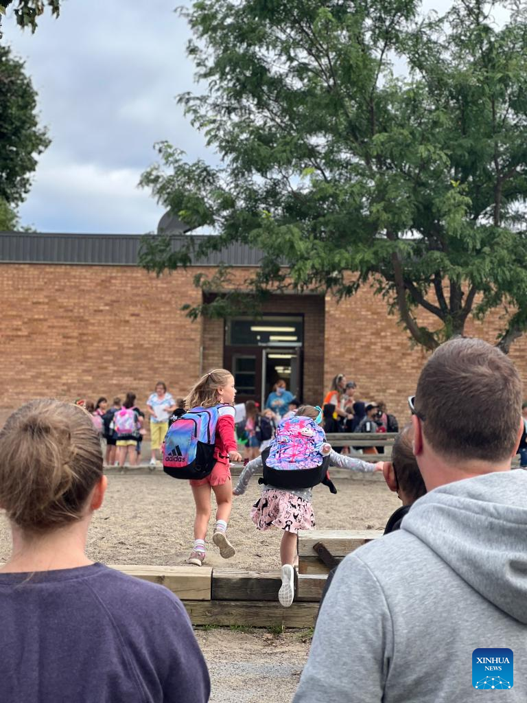 Parents watch kids walking into a school campus in Ottawa, Canada, on Sept. 6, 2022. Most students in Ottawa returned to school on Tuesday to start a new school year. (Photo by Min Chen/Xinhua)