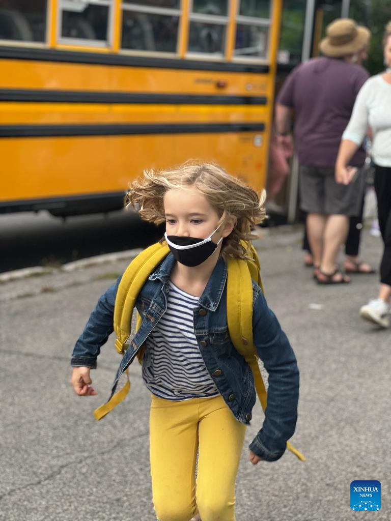 A girl passes a school bus on her way to school in Ottawa, Canada, on Sept. 6, 2022. Most students in Ottawa returned to school on Tuesday to start a new school year. (Photo by Min Chen/Xinhua)