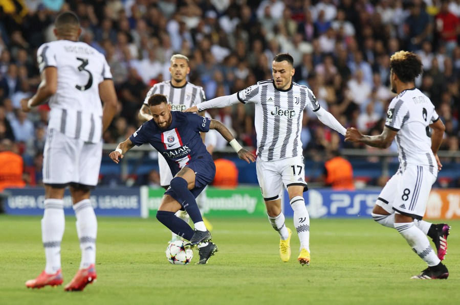 Paris Saint-Germain's Neymar (2nd L) competes during the UEFA Champions League Group H soccer match against Juventus at the Parc des Princes Stadium in Paris, Sept. 6, 2022. (Xinhua/Gao Jing)