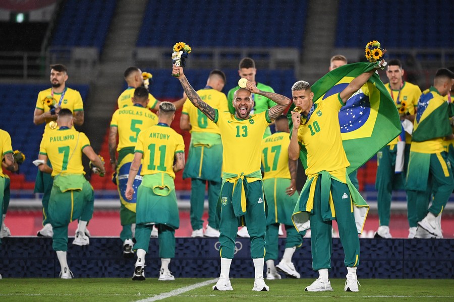 Dani Alves (Number 13) of Brazil celebrates during the awarding ceremony for the men's football at the Tokyo 2020 Olympic Games in Yokohama, Japan, Aug. 7, 2021. (Xinhua/Lu Yang)