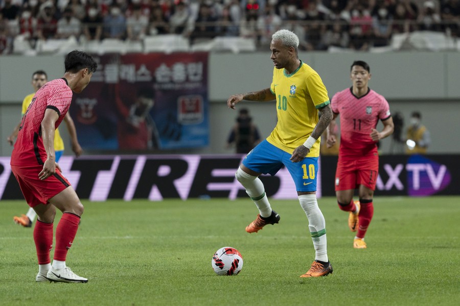 Brazil's Neymar Jr (front R) breaks through during a friendly match against South Korea in Seoul, June 2, 2022. (Photo by James Lee/Xinhua)