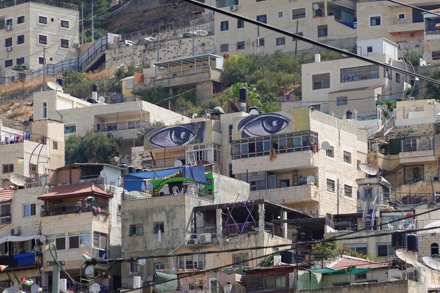 Photo taken on Sept. 6, 2022, shows a view of the Arab neighbourhood of Silwan in East Jerusalem. A group of artists have filled Silwan, a predominantly Arab area in East Jerusalem, with mural paintings of large, wide-open eyes to protest against the drive of Arabs out of their homes. (Xinhua/Wang Zhuolun)