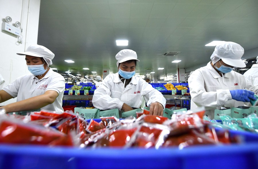 Workers pack Luosifen rice noodles at a food-processing company in Liuzhou, south China's Guangxi Zhuang Autonomous Region, Nov. 23, 2021. (Xinhua/Huang Xiaobang)