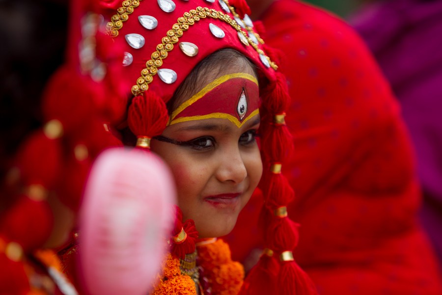 A girl dressed up as living Goddess Kumari takes part in a Kumari Puja worship in Kathmandu, Nepal on Sept. 8, 2022. (Photo by Sulav Shrestha/Xinhua)