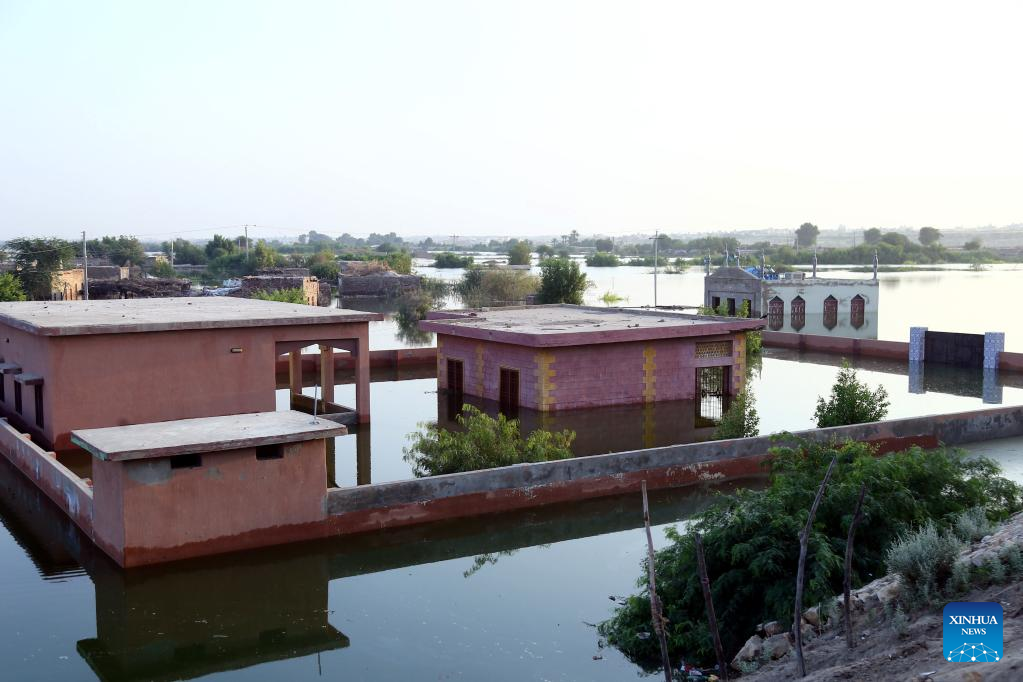 Photo taken on Sept. 8, 2022 shows flooded houses in Jamshoro district in Pakistan's Sindh province. At least 36 people were killed in heavy monsoon rain-triggered flash floods in the last 24 hours in Pakistan, the National Disaster Management Authority (NDMA) said. (Str/Xinhua)