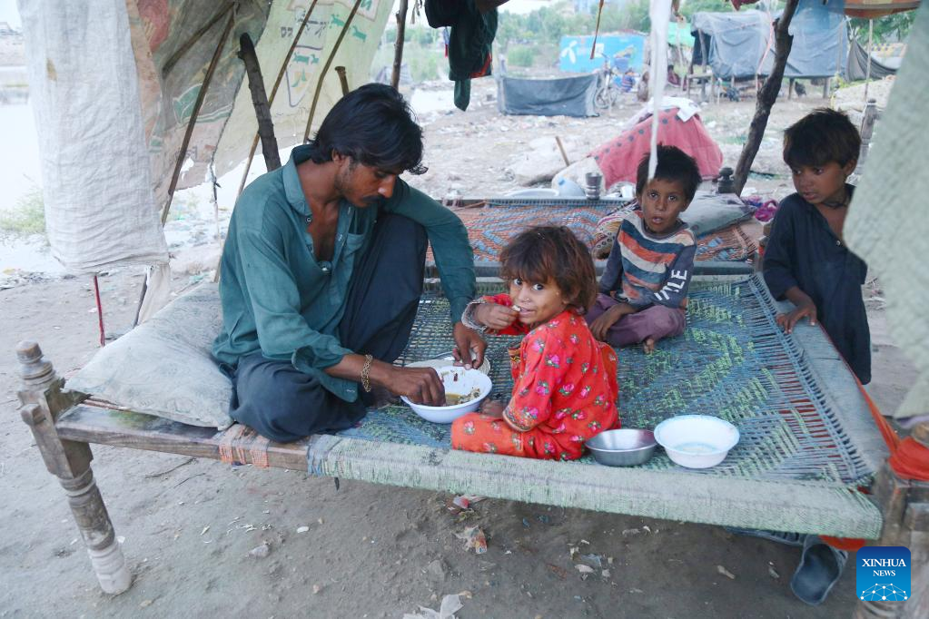A flood-affected man with children eats food at a makeshift tent in Jamshoro district in Pakistan's Sindh province on Sept. 8, 2022. At least 36 people were killed in heavy monsoon rain-triggered flash floods in the last 24 hours in Pakistan, the National Disaster Management Authority (NDMA) said. (Str/Xinhua)