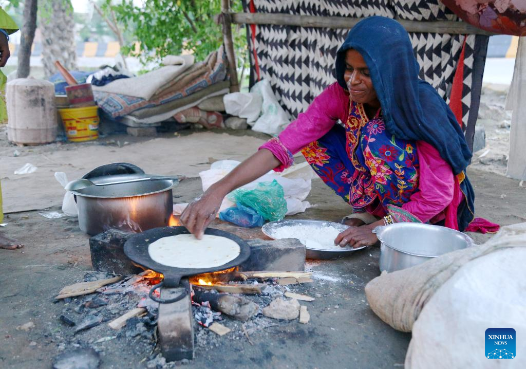A flood-affected woman prepares food in Jamshoro district in Pakistan's Sindh province on Sept. 8, 2022. At least 36 people were killed in heavy monsoon rain-triggered flash floods in the last 24 hours in Pakistan, the National Disaster Management Authority (NDMA) said. (Str/Xinhua)