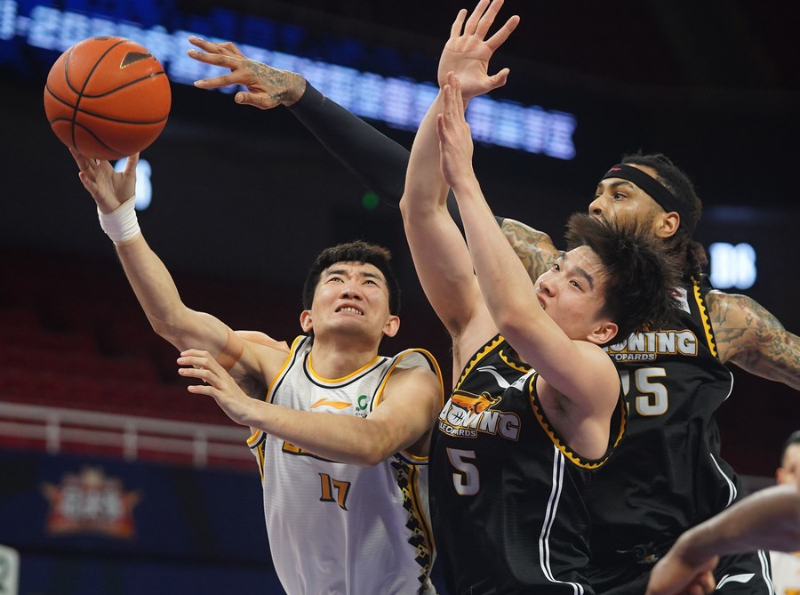 Sun Minghui (L) of Zhejiang Lions goes for a lay-up during the final match against Liaoning Flying Leopards at the 2021-2022 Chinese Basketball Association (CBA) league in Nanchang, east China's Jiangxi Province, April 26, 2022. (Xinhua/Wan Xiang)