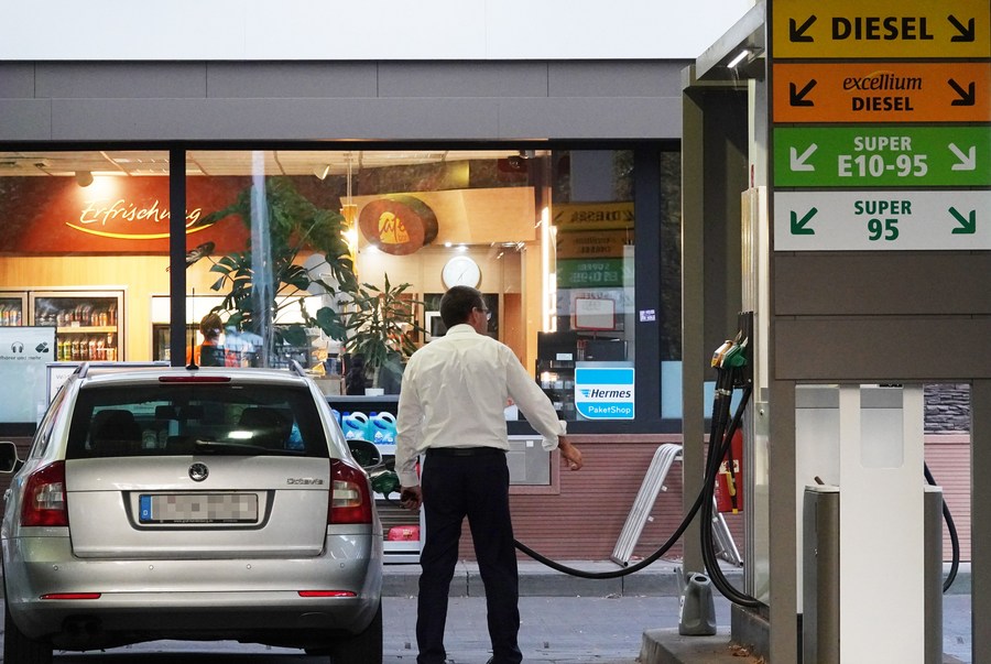 A man fuels a vehicle up at a gas station in Berlin, Germany, Sept. 5, 2022.(Xinhua/Ren Pengfei)