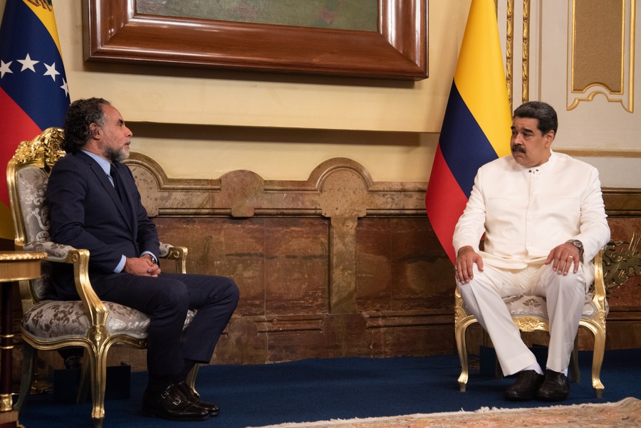 Colombia's new ambassador-designate to Venezuela, Armando Benedetti (L), meets with Venezuelan President Nicolas Maduro in Caracas, Venezuela, Aug. 29, 2022. (Photo by Marcos Salgado/Xinhua)