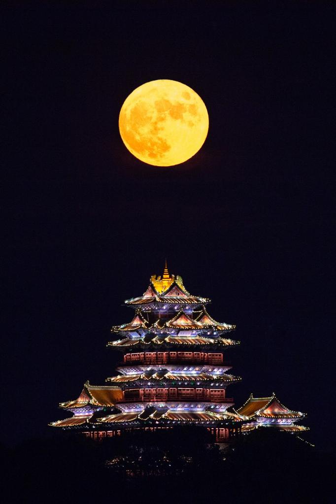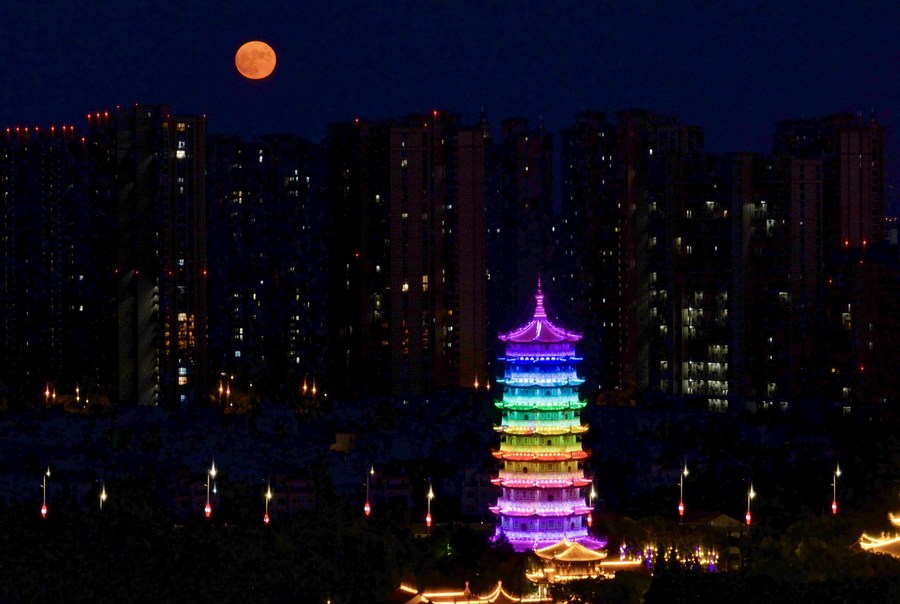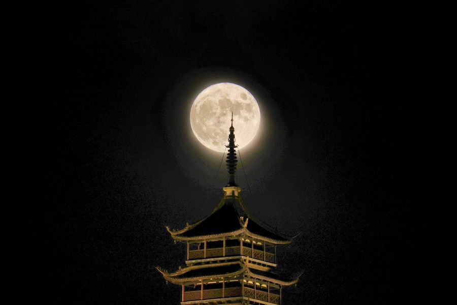 A full moon rises behind Huanghelou, or Yellow Crane Tower, in Wuhan, central China's Hubei Province, Sept. 10, 2022. (Photo by Zhou Guoqiang/Xinhua)