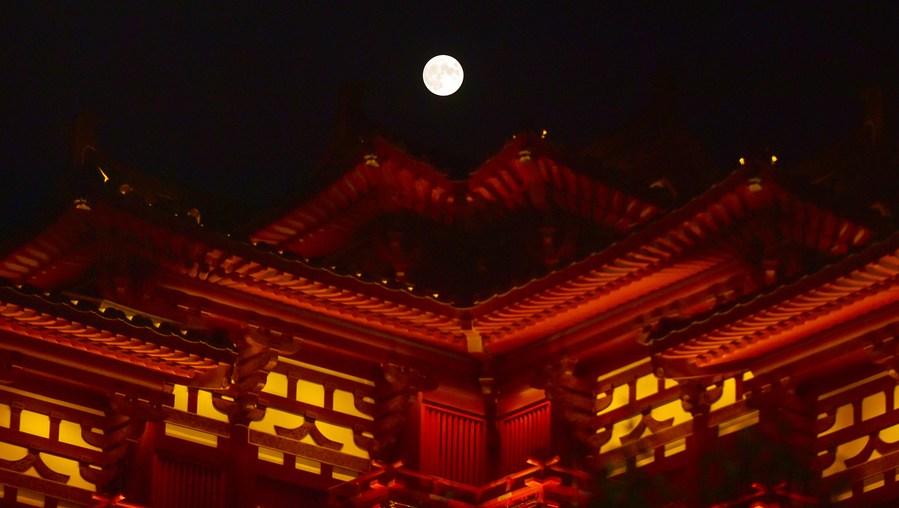 A full moon rises above the Yingtianmen site museum of the National Archaeological Site Park of Sui-Tang Luoyang City in Luoyang City, central China's Henan Province. Sept. 10, 2022. (Photo by Huang Zhengwei/Xinhua)