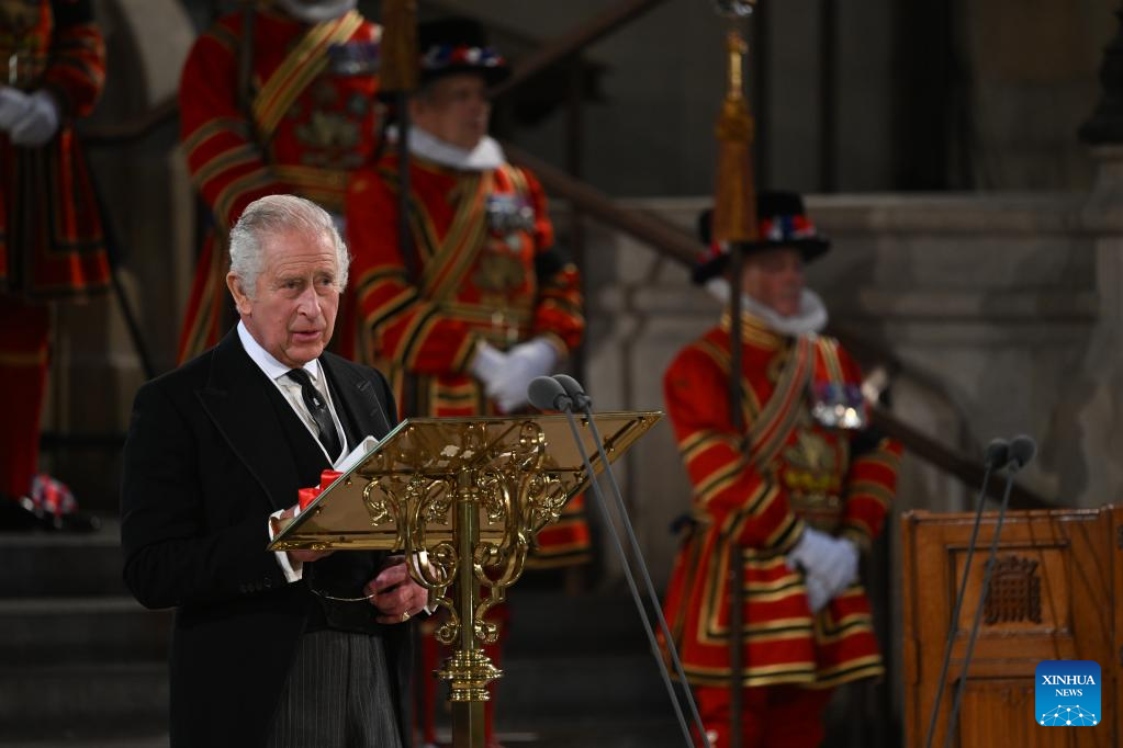 Britain's King Charles III (C) delivers his first address to the parliament in Westminster Hall in London, Britain, Sept. 12, 2022. Britain's King Charles III said he felt "the weight of history" and vowed to follow the example set by his late mother, Queen Elizabeth II, in his first address to the parliament on Monday. (Roger Harris/UK Parliament/Handout via Xinhua)