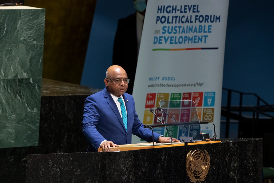 UN General Assembly President Abdulla Shahid speaks at the opening of the ministerial segment of the High-level Political Forum on sustainable development at the UN headquarters in New York, on July 13, 2022. (Eskinder Debebe/UN Photo/Handout via Xinhua)
