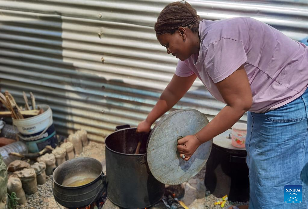 Maria Savage, a founder of Needy Hearts Soup Kitchen, prepares food in Hakahana, an informal settlement in Windhoek, Namibia, on Sept. 12, 2022. (Photo by Ndalimpinga Iita/Xinhua)
