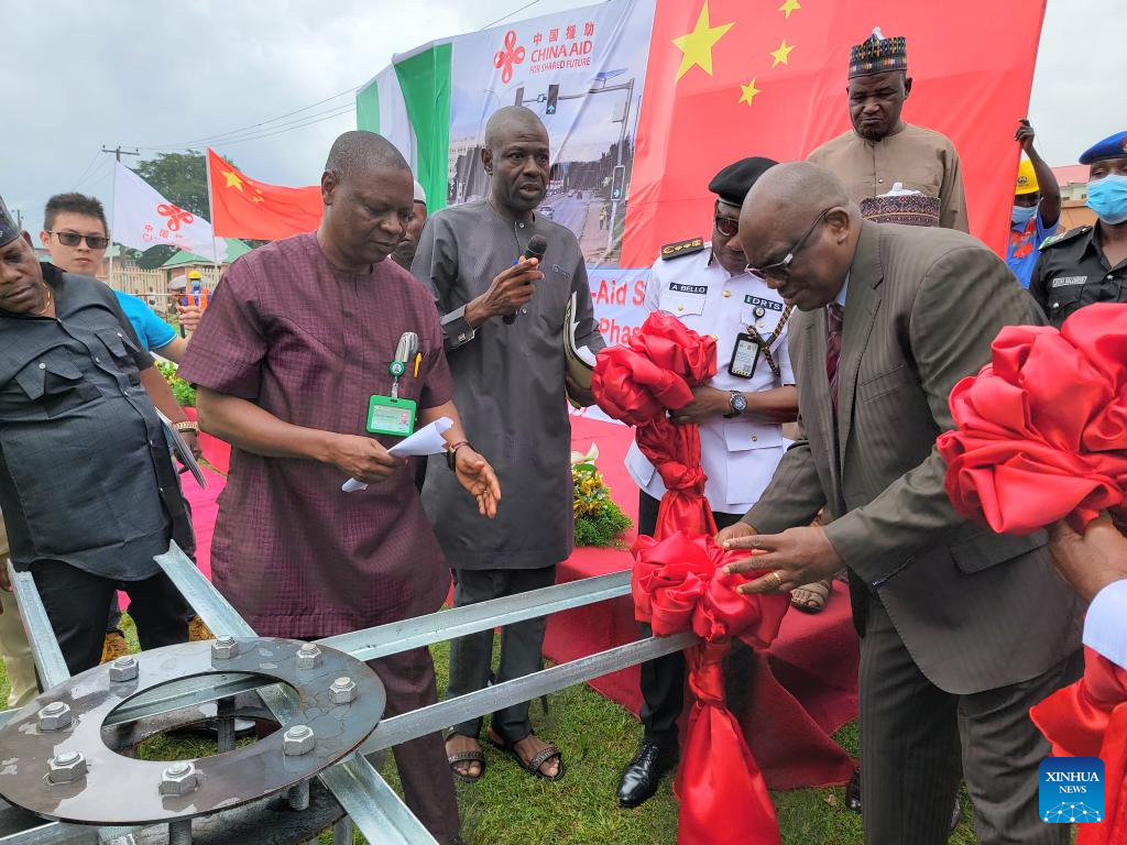 Photo taken on Sept. 13, 2022 shows a ceremony marking the launch of the second phase of a China-aided solar-powered traffic lights project in Abuja, Nigeria. A China-aided project started its second phase Tuesday to install solar-powered traffic light control signals at 98 intersections here in the Nigerian capital, involving at least 80 skilled workers and five local managers. (Xinhua/Guo Jun)