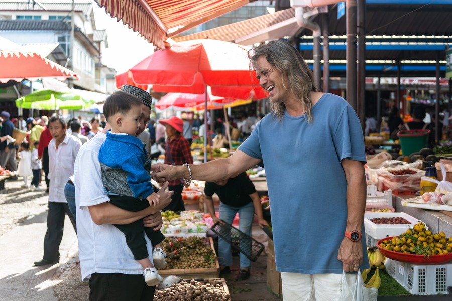 Brian Linden greets a child in Xizhou old town of southwest China's Yunnan Province, Aug. 28, 2022. (Xinhua/Cao Mengyao)