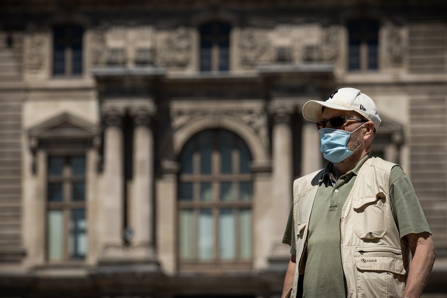A man wearing a face mask walks in front of the Louvre Museum in Paris, France, July 8, 2022. (Photo by Aurelien Morissard/Xinhua)