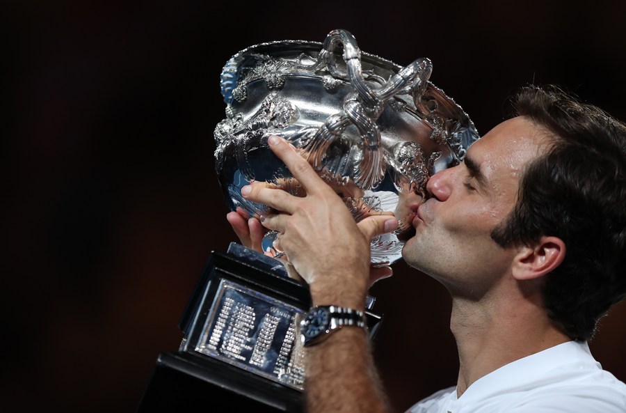 Roger Federer kisses his trophy during the awarding ceremony at Australian Open 2018 in Melbourne, Australia, Jan. 28, 2018. (Xinhua/Bai Xuefei)