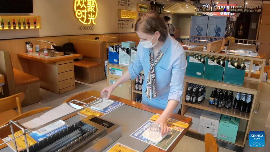 A video clip shows Tatyana Chupina arranging tableware at her restaurant in Harbin, northeast China's Heilongjiang Province, May 25, 2022. (Xinhua/Wang Junbao)