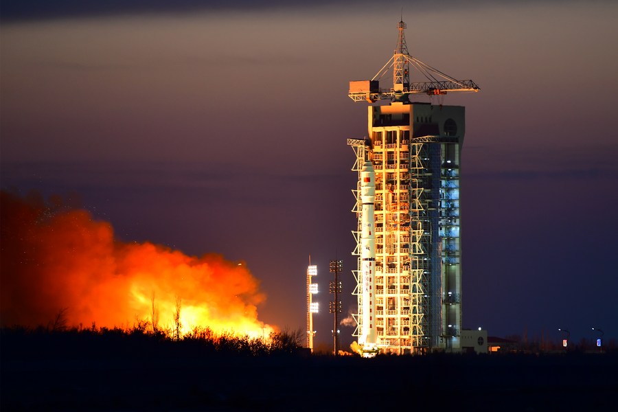 A Long March-4B rocket carrying the Shijian-6 05 satellites blasts off from the Jiuquan Satellite Launch Center in northwest China, Dec. 10, 2021. (Photo by Wang Jiangbo/Xinhua)