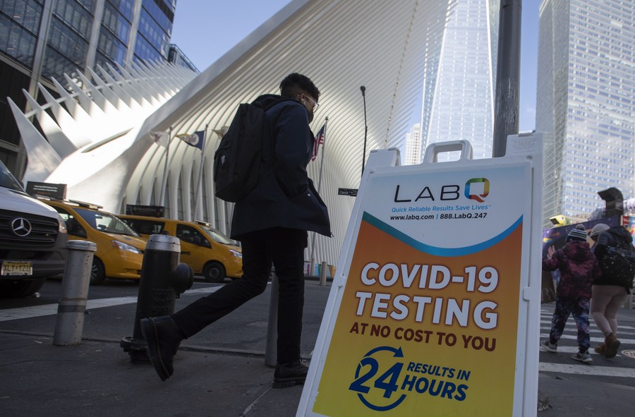 Pedestrians walk past a COVID-19 testing site near the World Trade Center in New York, the United States, March 29, 2022. (Xinhua/Wang Ying)