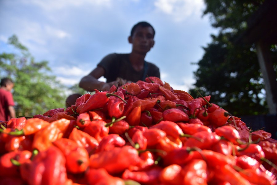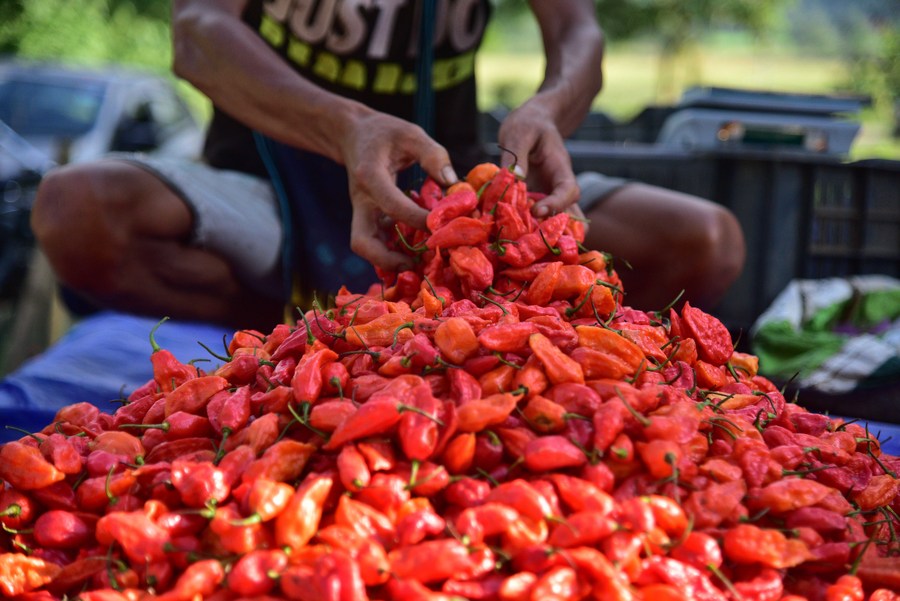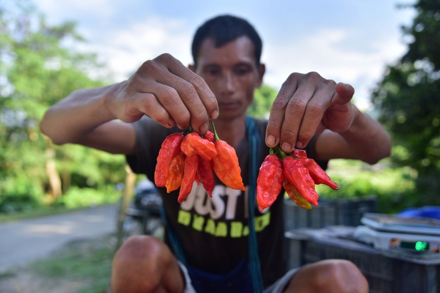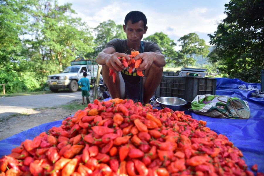 Picture taken on Sept. 15, 2022, shows a vendor selling ghost chilli, locally known as "bhut jolokia" at a market in Nagaon district of India's northeastern state of Assam. (Str/Xinhua)