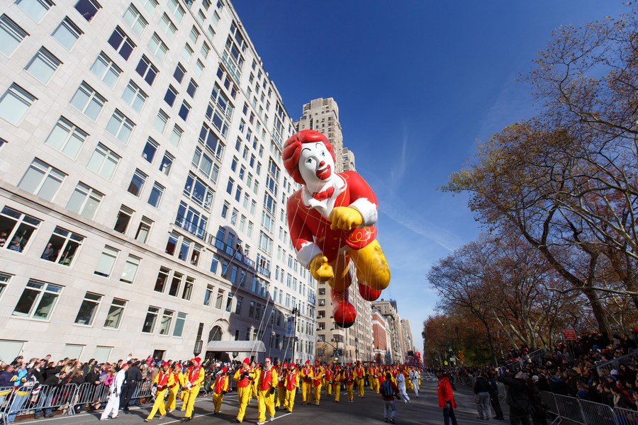 Photo taken on Nov. 26, 2015, shows the balloon of Ronald McDonald is seen during the 89th Macy's Thanksgiving Day Parade in New York, the United States. (Xinhua/Li Muzi)