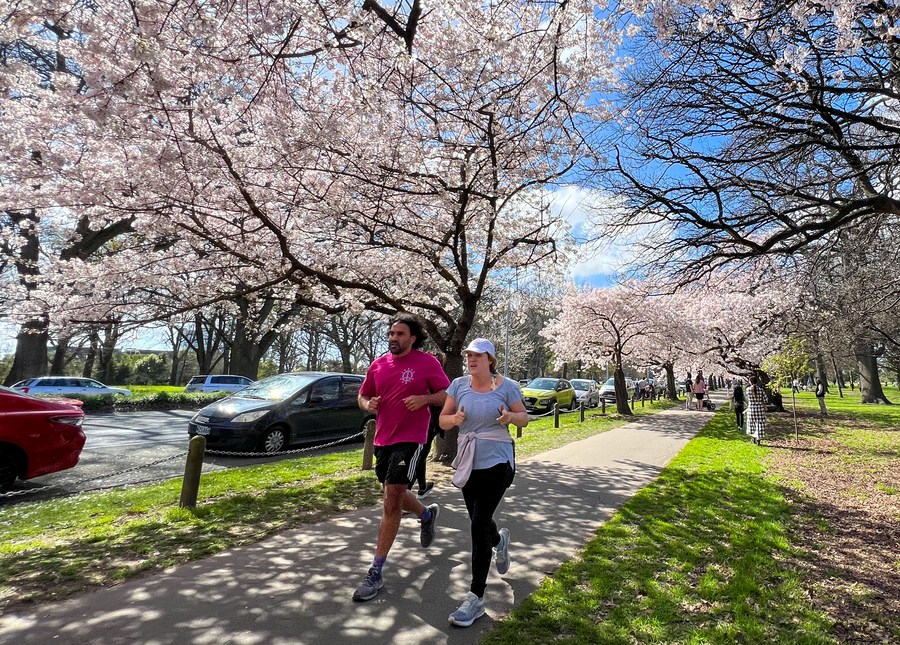 Joggers run through cherry blossoms in Hagley Park at Christchurch, New Zealand on Sept. 17, 2022. (Photo by Walter/Xinhua)■