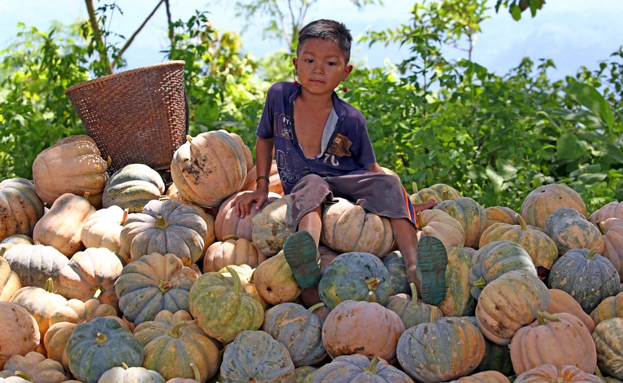 A boy sits on a pile of freshly harvested pumpkins at a village in Chattogram Hill Tracts region in Bangladesh on Sept. 12, 2022. (Xinhua)