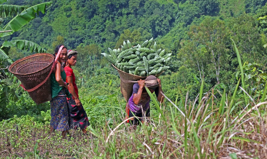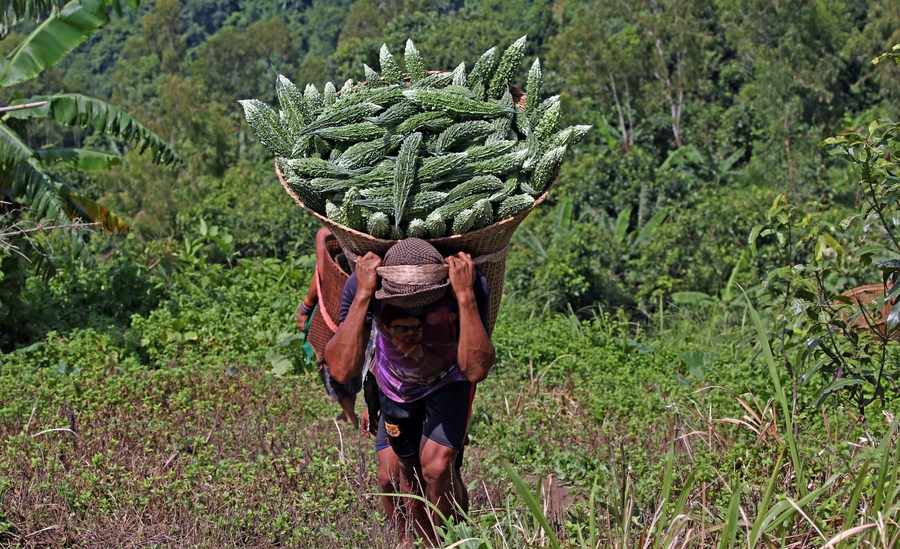 A farmer carries a basket of bitter gourds at a village in Chattogram Hill Tracts region in Bangladesh on Sept. 12, 2022. (Xinhua)