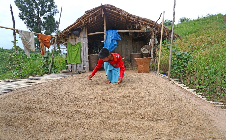 A farmer dries paddy on a bamboo platform in front of a hut at a village in Chattogram Hill Tracts region in Bangladesh on Sept. 12, 2022. (Xinhua)