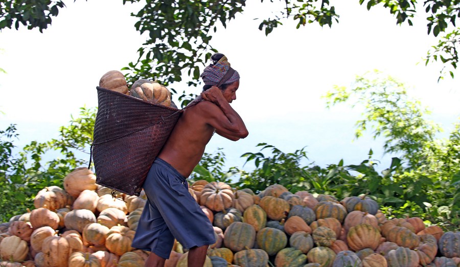 A man carries a basket full of pumpkins at a village in Chattogram Hill Tracts region in Bangladesh, on Sept. 12, 2022. (Xinhua) ■