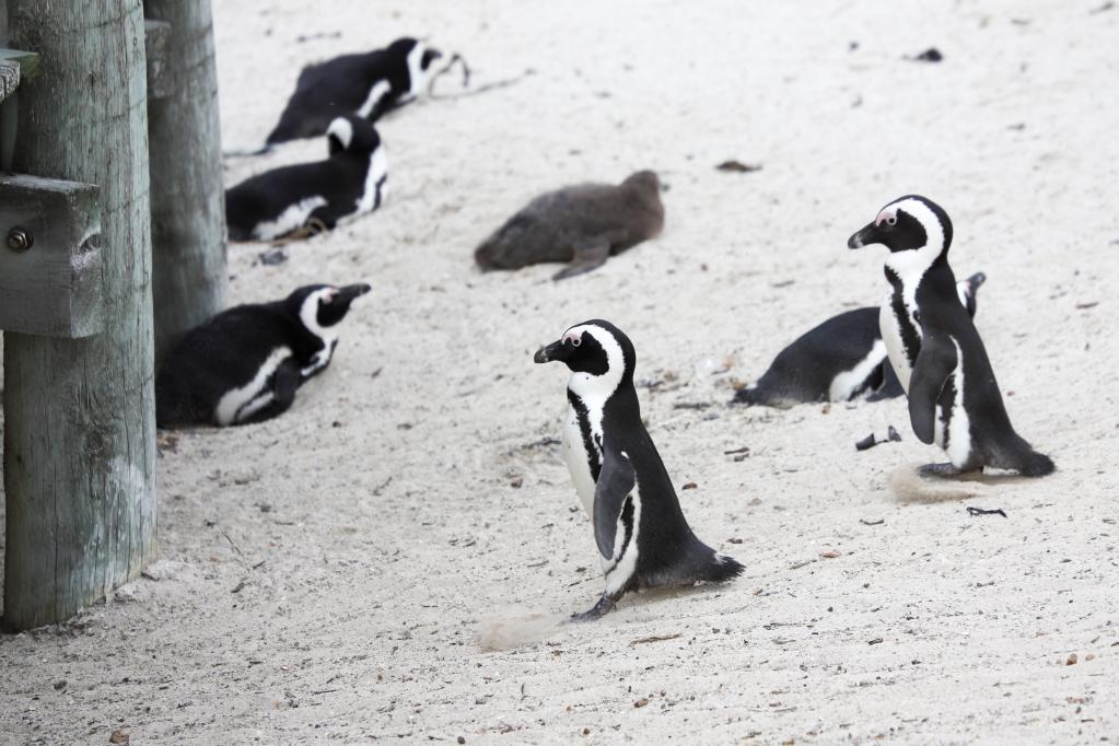 The file photo shows African penguins walking on the beach at Boulders Penguin Colony, Simon's Town, southwest South Africa, on April 25, 2021. (Xinhua/Lyu Tianran)