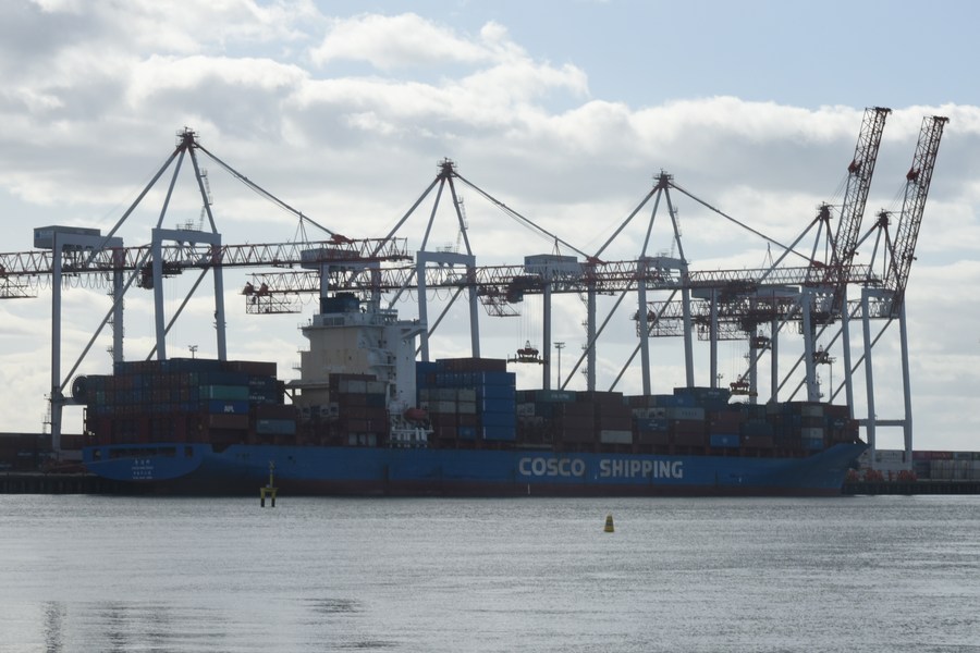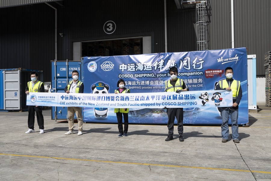 A container with New Zealand and Vanuatu products depart from the Port of Tauranga, New Zealand's largest port, to attend the fifth China International Import Expo (CIIE) 2022 in Shanghai, which will create new opportunities for New Zealand companies to explore the Chinese market and strengthen business exchanges between the two countries.