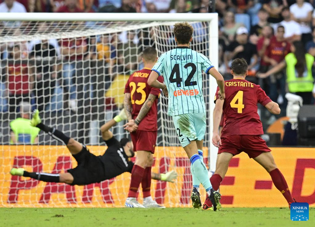 Atalanta's Giorgio Scalvini (L) scores his goal during a Serie A football match between Roma and Atalanta in Rome, Italy, on Sept. 18, 2022. (Photo by Augusto Casasoli/Xinhua)