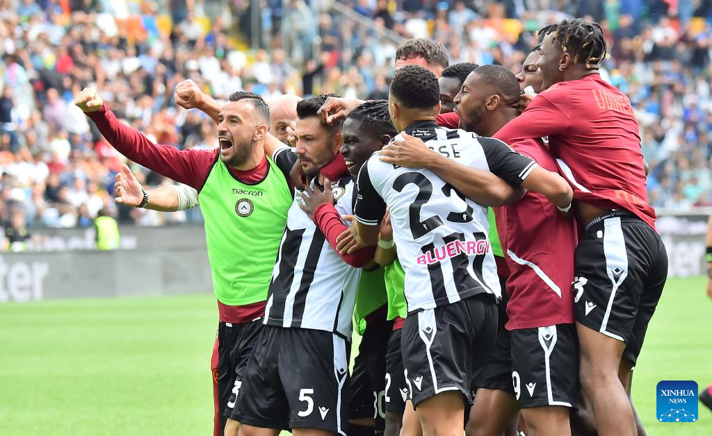 Udinese's Tolgay Arslan (2nd L) celebrates scoring with his teammates during a Serie A soccer match between Udinese and FC Inter in Udine, Italy, on Sept. 18, 2022. (Str/Xinhua)
