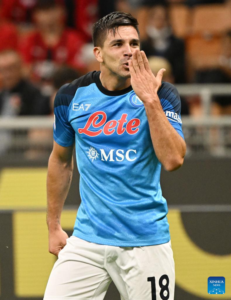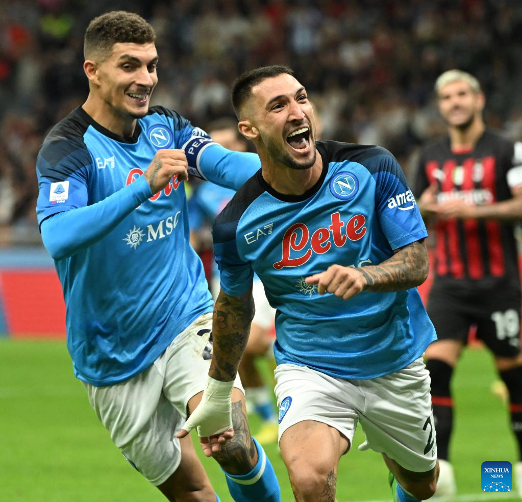 Napoli's Matteo Politano (R) celebrates scoring during a Serie A football match between AC Milan and Napoli in Milan, Italy, on Sept. 18, 2022. (Photo by Alberto Lingria/Xinhua)