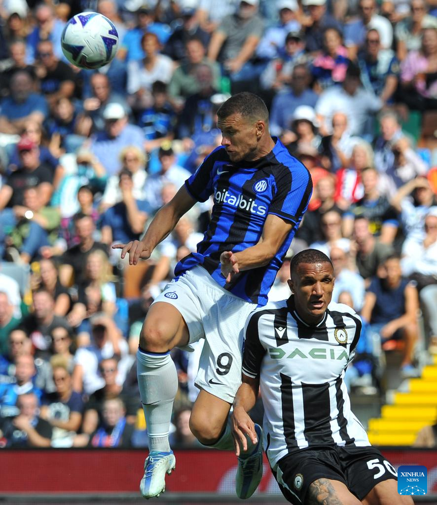 FC Inter's Edin Dzeko (L) competes during a Serie A soccer match between Udinese and FC Inter in Udine, Italy, on Sept. 18, 2022. (Str/Xinhua)