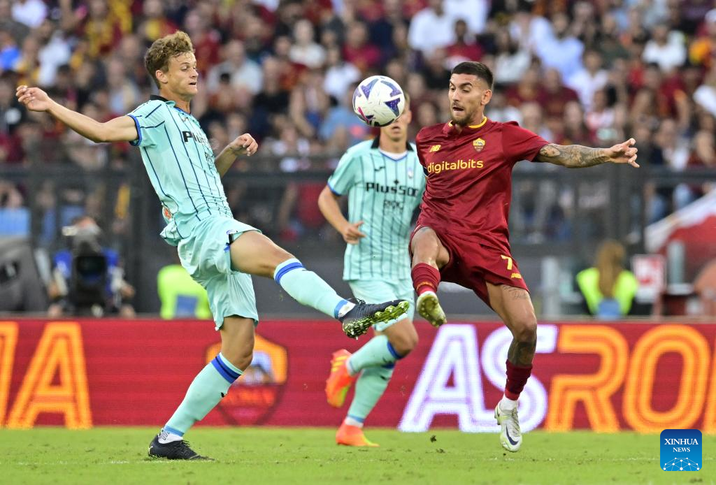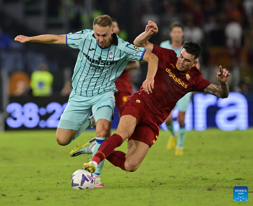 Roma's Lorenzo Pellegrini (R) vies with Atalanta's Giorgio Scalvini during a Serie A football match between Roma and Atalanta in Rome, Italy, on Sept. 18, 2022. (Photo by Augusto Casasoli/Xinhua)