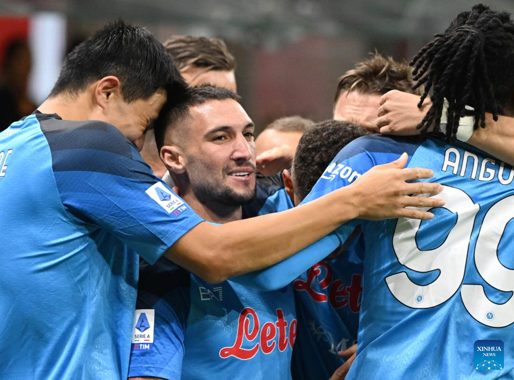 Napoli's Matteo Politano (2nd L) celebrates scoring with his teammates during a Serie A football match between AC Milan and Napoli in Milan, Italy, on Sept. 18, 2022. (Photo by Alberto Lingria/Xinhua)