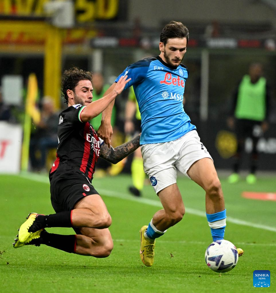 AC Milan's Davide Calabria (L) vies with Napoli's Khvicha Kvaratskhelia during a Serie A football match between AC Milan and Napoli in Milan, Italy, on Sept. 18, 2022. (Photo by Alberto Lingria/Xinhua)