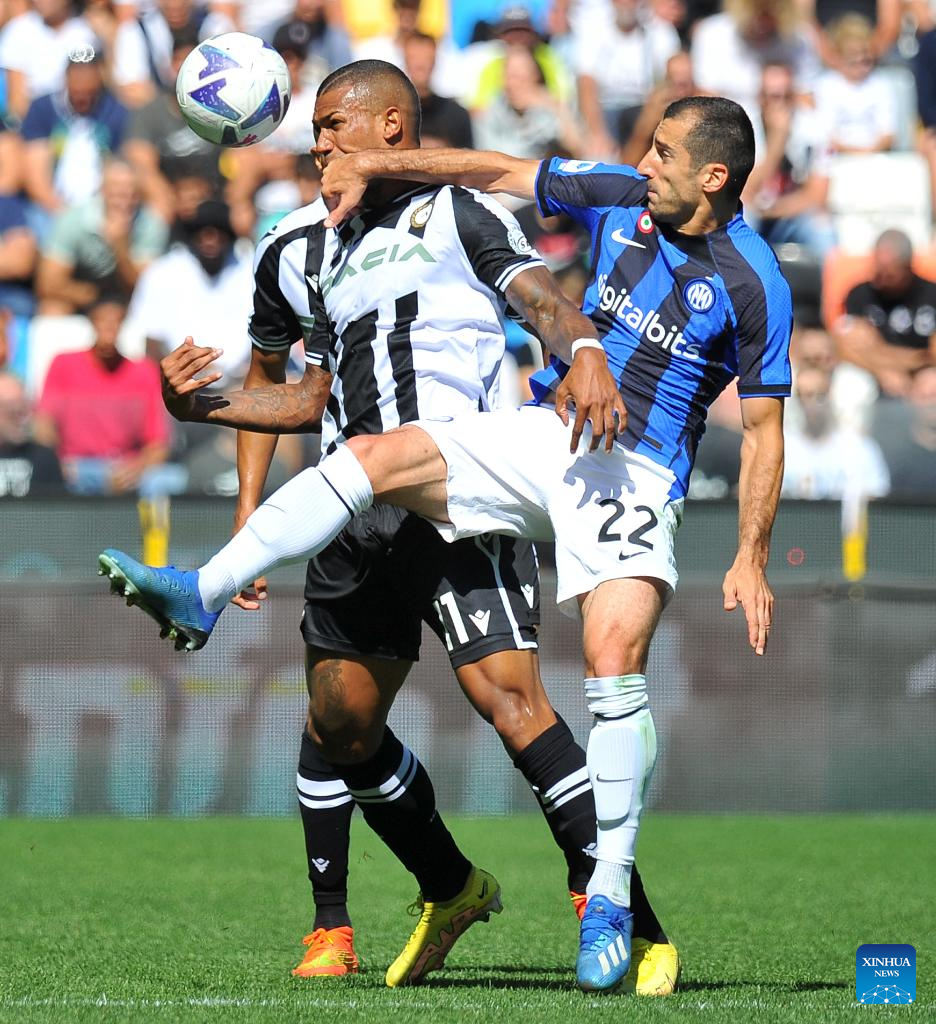 FC Inter's Henrikh Mkhitaryan (R) vies with Udinese's Walace during a Serie A soccer match between Udinese and FC Inter in Udine, Italy, on Sept. 18, 2022. (Str/Xinhua)