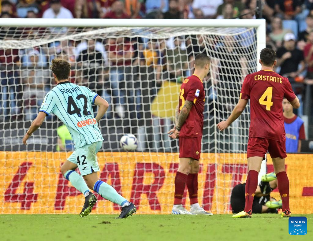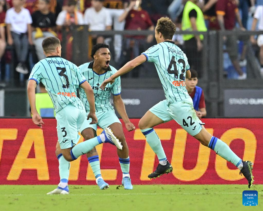 Atalanta's Giorgio Scalvini (2nd R) scores his goal during a Serie A football match between Roma and Atalanta in Rome, Italy, on Sept. 18, 2022. (Photo by Augusto Casasoli/Xinhua)