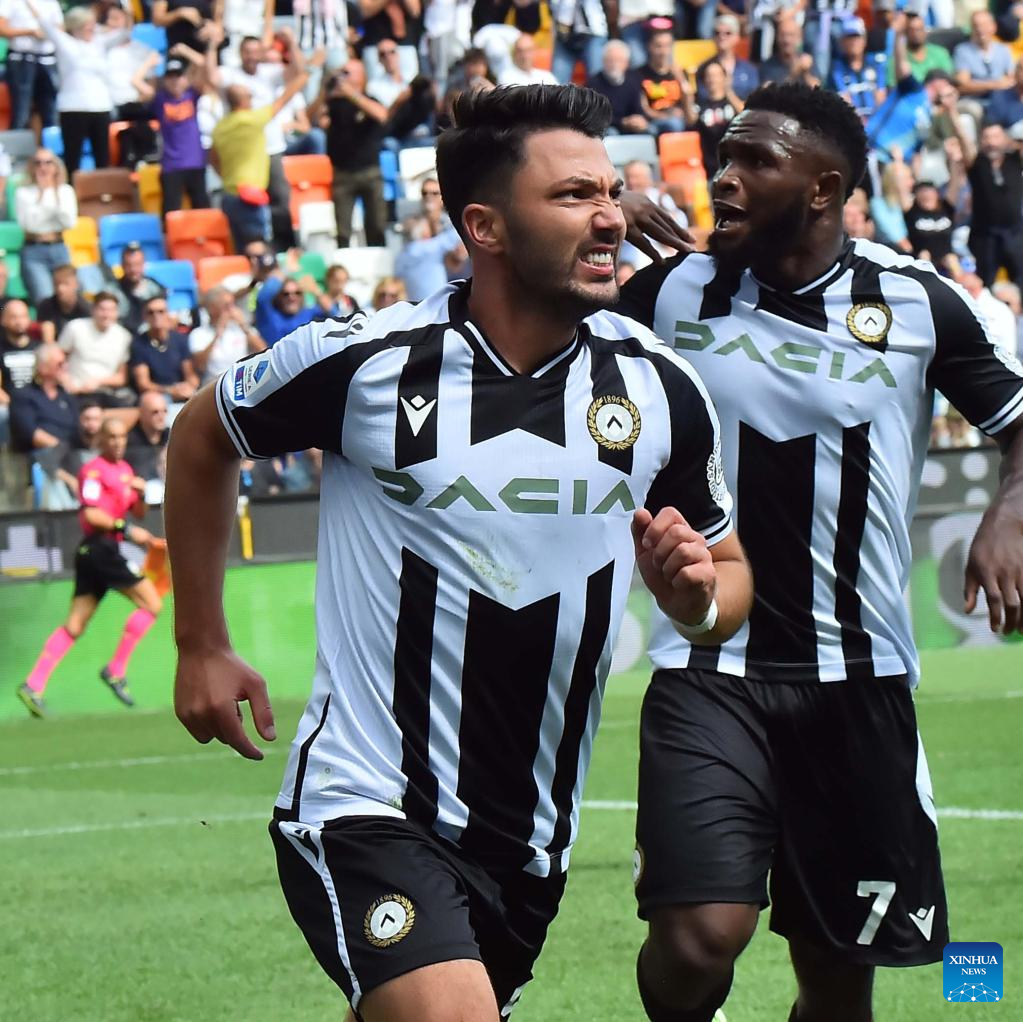 Udinese's Tolgay Arslan (L) celebrates scoring during a Serie A soccer match between Udinese and FC Inter in Udine, Italy, on Sept. 18, 2022. (Str/Xinhua)