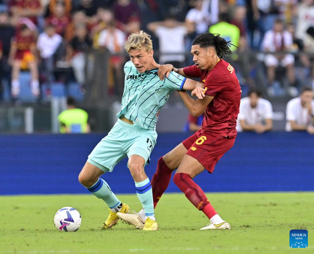 Roma's Roger Ibanez (R) vies with Atalanta's Teun Koopmeiners during a Serie A football match between Roma and Atalanta in Rome, Italy, on Sept. 18, 2022. (Photo by Augusto Casasoli/Xinhua)