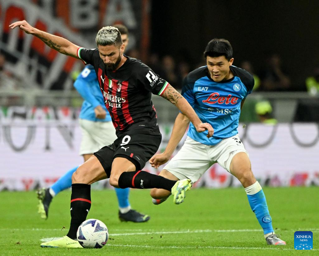 AC Milan's Olivier Giroud (L) vies with Napoli's Kim Min-Jae during a Serie A football match between AC Milan and Napoli in Milan, Italy, on Sept. 18, 2022. (Photo by Alberto Lingria/Xinhua)
