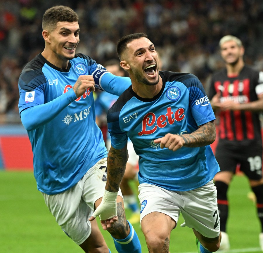 Napoli's Matteo Politano (R) celebrates after scoring in his side's 2-1 win over AC Milan on Sept. 18, 2022. (Photo by Alberto Lingria/Xinhua)